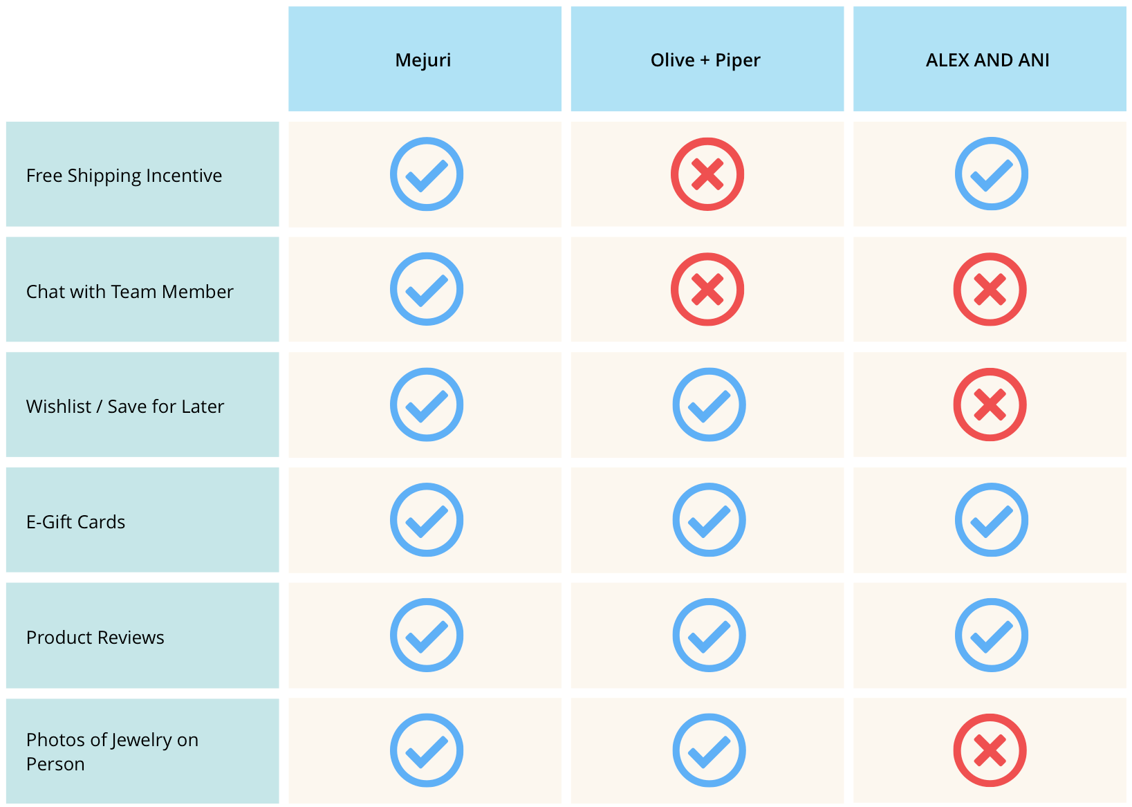 These element analyses gave me a good starting point to narrow down on some of the features I found beneficial on e-commerce sites selling jewelry. The feature inventory below lists those important features and shows which ones Mejuri, Olive + Piper, and Alex and Ani offer.